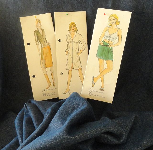 A coat dress, a slim denim skirt with a contrast panel of Thai silk and a denim skort.
